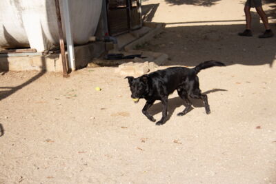 Mit den freiwilligen Helfern zeigt er sich sehr anhänglich und gehorsam, er mag ihre Aufmerksamkeit und das Spielen mit dem Ball.