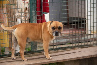 Unser lieber Ferdinand (der Stier) ist ein Bait Dog ein sogenannter Köderhund. Der dazu missbraucht wurde, um Hunde für Hundekämpfe scharf zu machen. Ihm Wurden beide Ohren ganz kurz abgeschnitten so wie sein Schwanz kupiert.