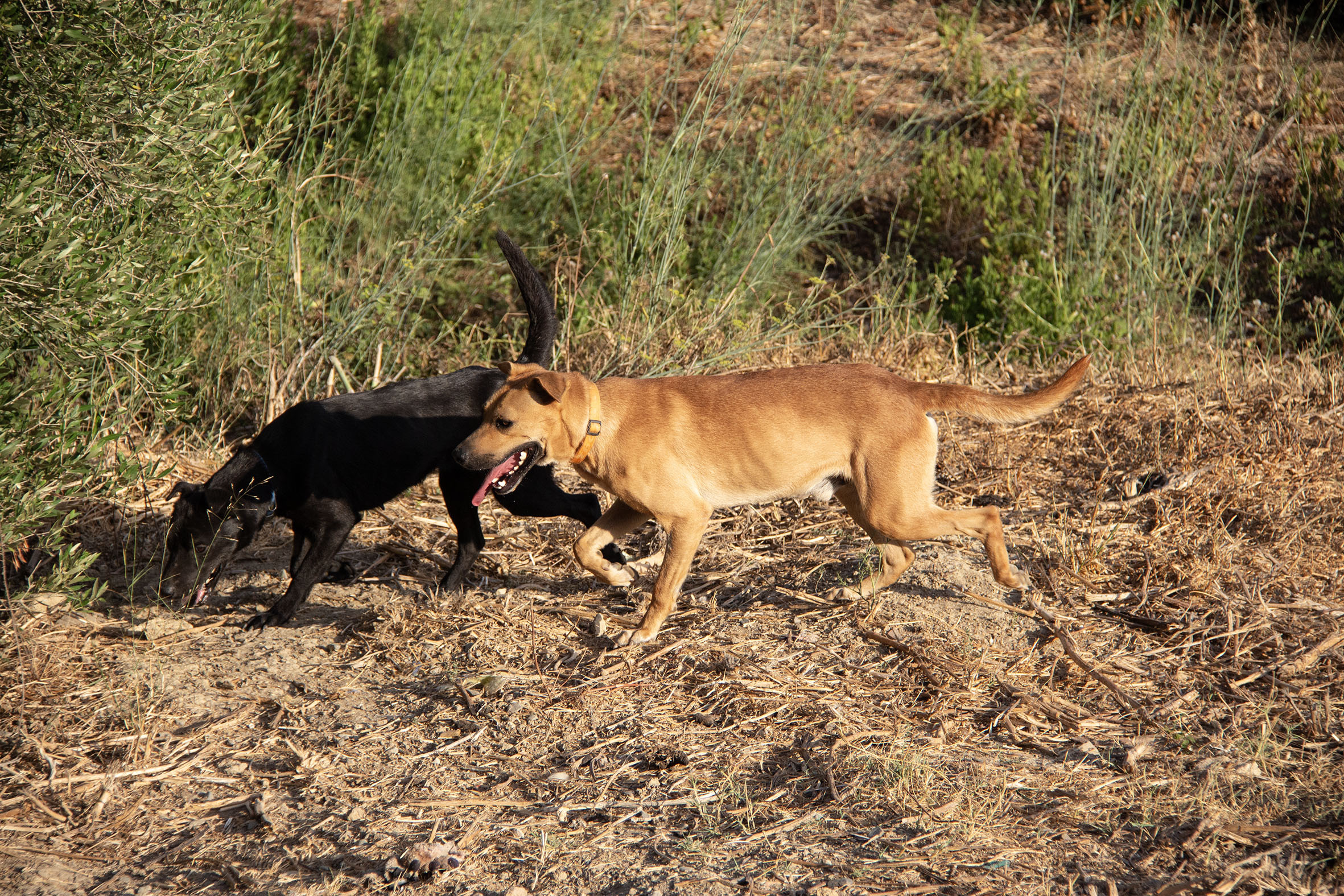 Im Kontakt zu anderen Hunden ist vor allem Fuji eher schüchtern und hält etwas Abstand zu den anderen Hunden. Vielleicht hatten sie in ihrer Vergangenheit nur wenig Kontakt zu anderen Hunden und sind es sich einfach noch nicht gewohnt. Da die Hunde in Melampo aber täglich Kontakt zu anderen Hunden haben und Freilauf in der grossen Hundegruppe geniessen, werden sie sich wohl bald sozialisieren und sicherer werden.