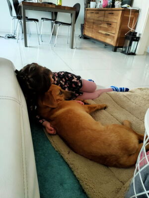 Guara ist in der Wohnung eine sehr ruhige, verschmuste, super brave und angenehme junge Hündin.