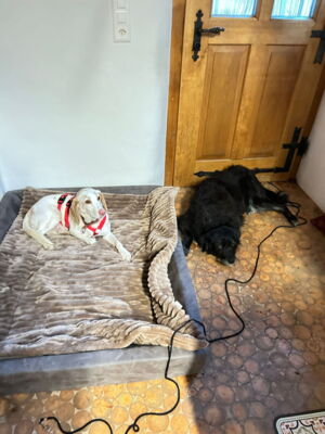 Im häuslichen Umfeld bewegt sich Haro sicher und fühlt sich sichtlich wohl. Die Anwesenheit meiner Hündin ist kein Problem; Haro kommt gut mit ihr zurecht, auch wenn er den Kontakt zu ihr nicht aktiv sucht. Für ihn steht die Interaktion mit Menschen klar im Vordergrund.