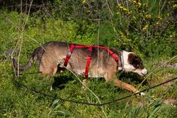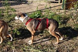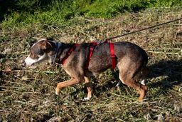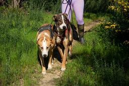Sunna akzeptiert, dass man ihr im Kennel ein Geschirr anzieht. Sie lässt sich in der näheren Umgebung der Pflegestelle an der Leine spazieren führen und traut sich in der Zwischenzeit auch an belebteren Strassen zu spazieren. Helios hingegen verlässt seinen Kennel nicht so gerne. In ruhigeren Gegenden kann aber auch er auf Spaziergänge mitgenommen werden.