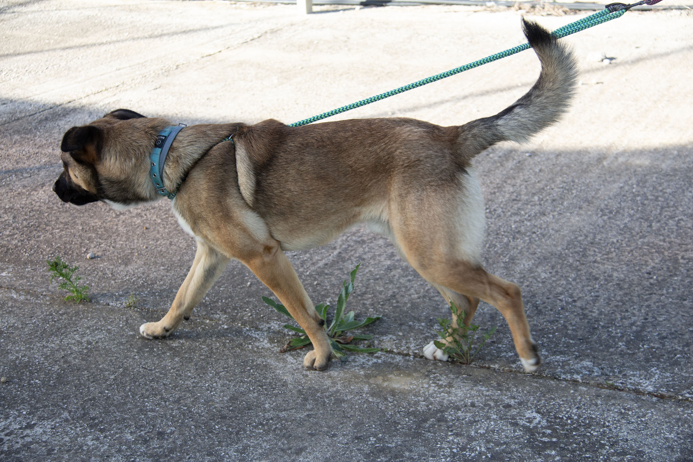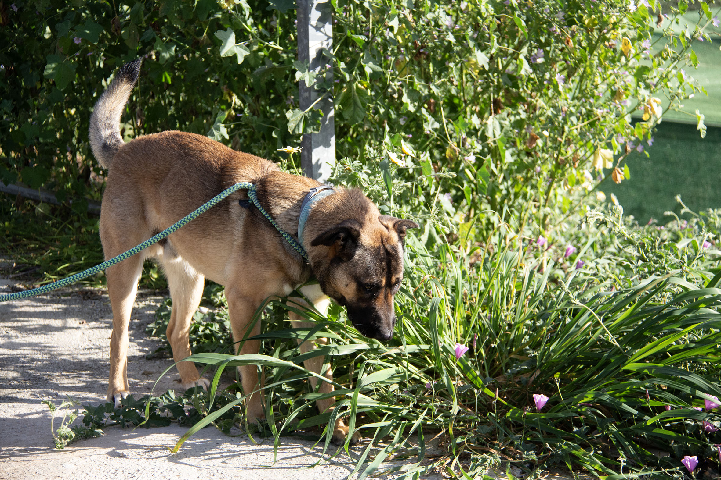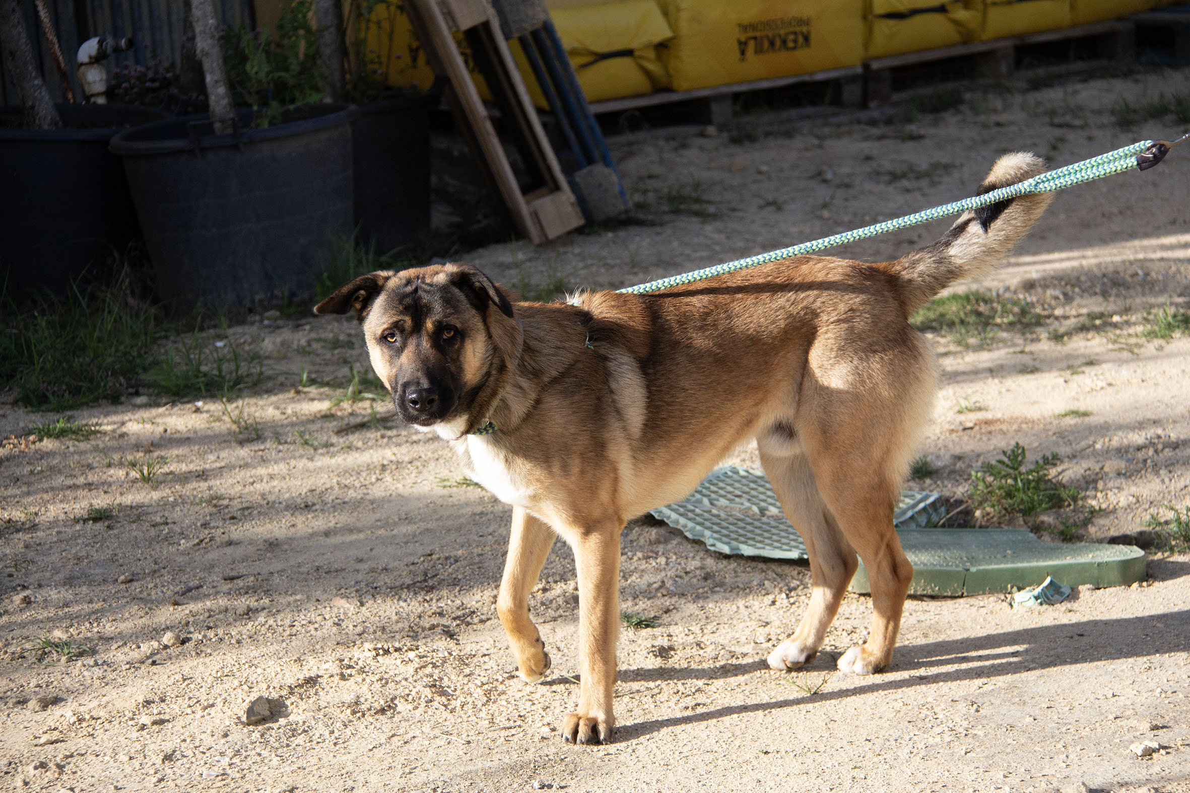 Zurück im Melampo-Camp zeigt sich Kamiel bisher gut im Verhalten – auch im Umgang mit seinen Artgenossen. Wir haben festgestellt, dass er ein toller Hund ist: aktiv, energiegeladen, verspielt – und er liebt es, im Wasser zu planschen. Er spielt und interagiert gerne mit anderen Hunden. Auch Spielzeug mag er sehr. Kommt jedoch zu viel Spannung, Rivalität oder Aufregung ins Spiel, kann es vorkommen, dass er wütend reagiert – auch wenn das nicht die Regel ist. Im Alltag rennt und spielt er täglich mit anderen Hunden und Spielzeug – in der Regel völlig unproblematisch. Nur in einzelnen Momenten kann es nötig sein, ihn zu korrigieren.