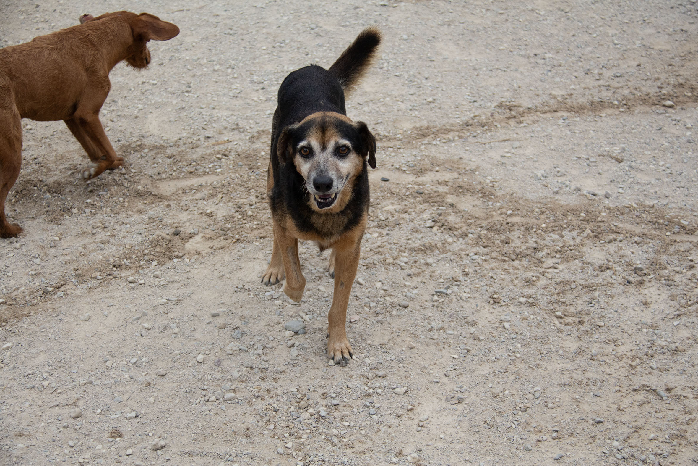 Er hat einen grossartigen Charakter, geht in der grossen Gruppe, mit Rüden und Hündinnen, in den Auslauf und meidet Probleme. Jeden Tag ist er kontaktfreudiger und gehorcht sofort, wenn die Helfer ihn nach dem Auslauf bitten wieder in seine Caseta (Gehege) zu gehen. Poppet läuft schon gut an der Leine.