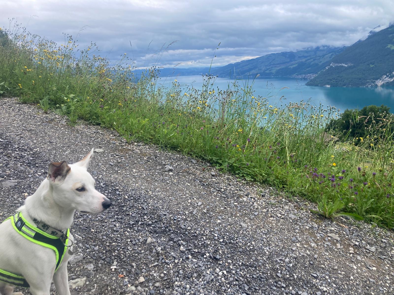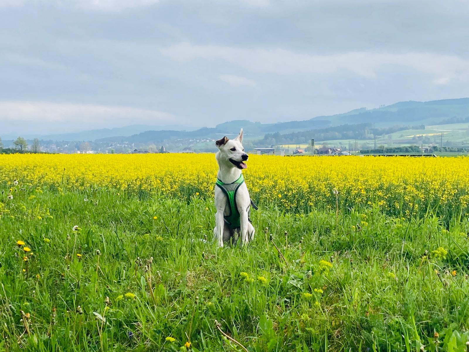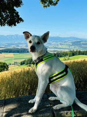 Sein Gehorsam ist erstaunlich gut, für das, dass wir zusammen nie trainiert haben. Die Befehle «warte, chehrä, hier, fuss usw.» funktionieren 1A und er ist weitgehend ohne Leine unterwegs. Sobald wir andere Personen, Jogger oder Velos gesehen haben und auch kreuzten, musste er einfach bei fuss laufen, meist auch für einen kurzen Moment an der Leine, einfach zur Sicherheit und er macht grundsätzlich keine Anstalten die «Gegenpartei» anzukläffen o.ä., ausser, Personen, besonders Männer, mit Baseballcaps, ihnen gegenüber ist er super unsicher, zieht den Schwanz ein und bellt.