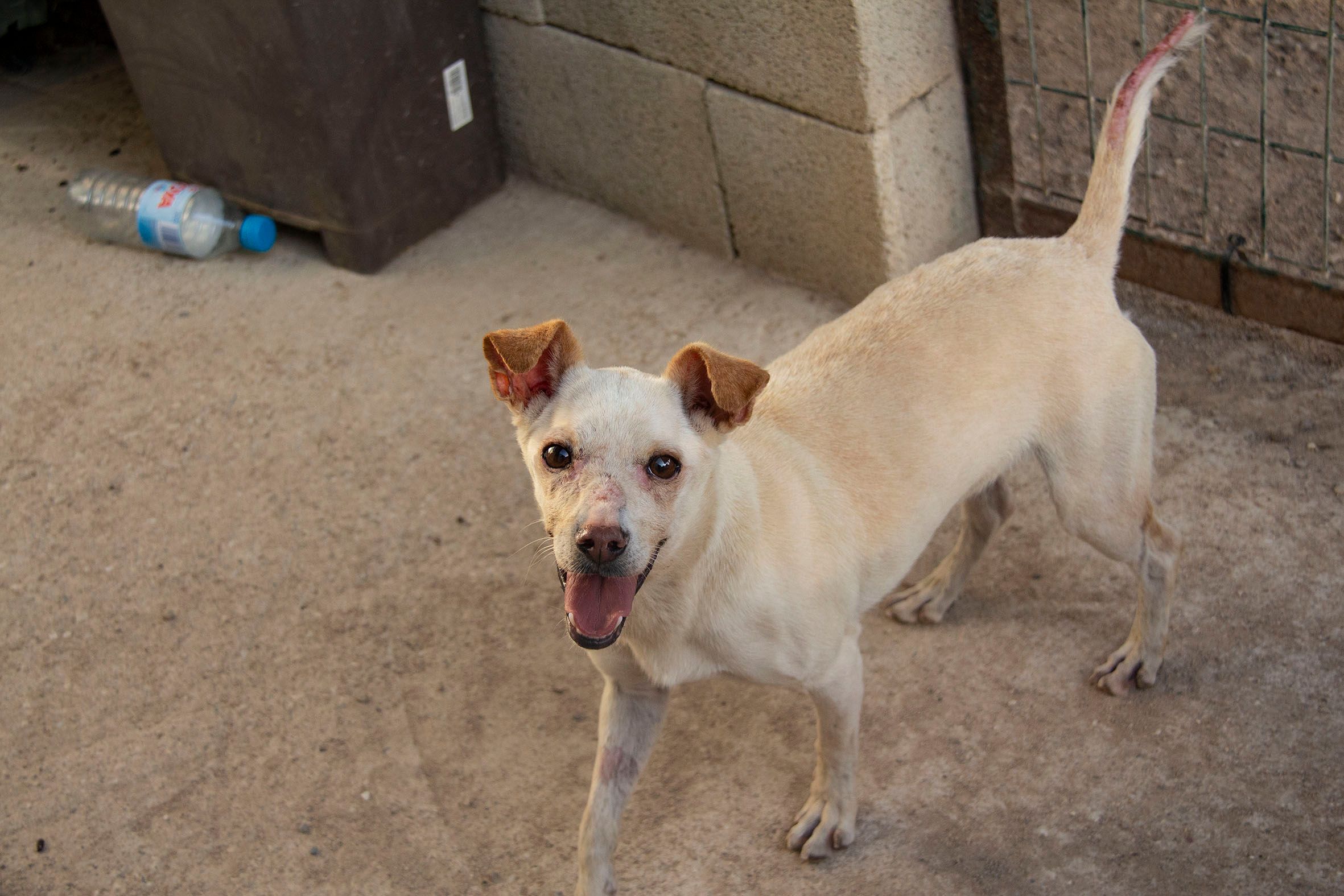 Der kleine Wilo wurde wohl ausgesetzt und in der Nähe von San Roque gefunden. Er konnte zum Glück in Melampo untergebracht werden. Leider war seine Haut in einem sehr schlechten Zustand. Vor allem im Gesicht und an seiner Rute waren kahle Stellen zu sehen und er litt unter starkem Juckreiz. Daraufhin wurde er vom Tierarzt untersucht und es wurden Blutproben genommen. Zum Glück konnte er negativ auf Mittelmeerkrankheiten getestet werden.