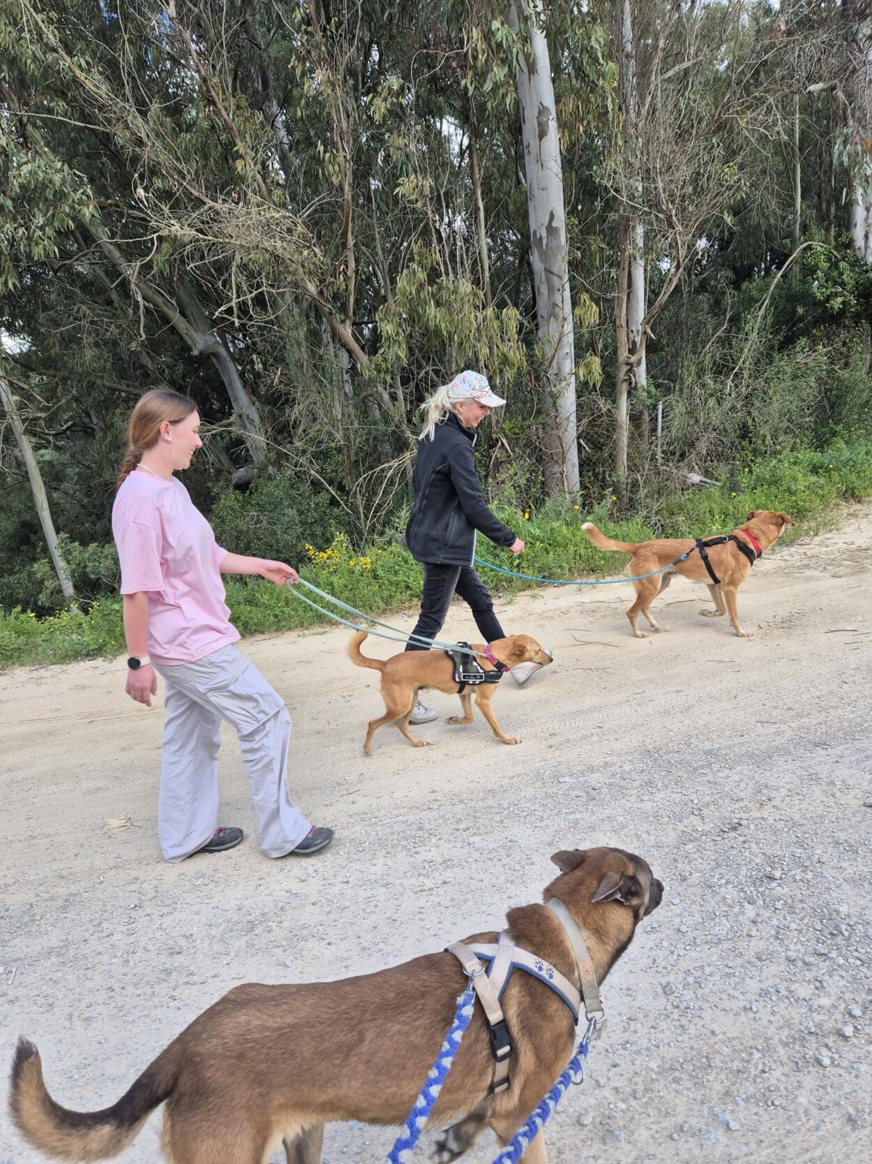 Anfangs wussten wir nicht recht, was unsere Aufgabe ist. Wie Sandra in Aussicht gestellt hat, ist die effektive Mitarbeit im Tierheimalltag zweitrangig resp. gar nicht erforderlich. Natürlich packten wir auch mit an, beim Futter versorgen oder ich durfte mit José Torx und Zocco zum Tierarzt für die Kastration fahren. Auch beim Sammeln des Kotes auf dem Gelände packten wir öpe mau dSchuflä😊. Aber unsere Hauptaufgabe – und das begriff ich erst nach 2 Tagen – war wirklich, mit unserer eigenen Energie und Liebe, den Hunden Gesellschaft zu leisten. Und es wurde von niemandem mehr erwartet von uns, was mich umso mehr berührte mich aber auch erst verunsicherte; die Pfleger und die freiwilligen lokalen Helferhelden arbeiten und du sitzt da mitten in einer Hundemeute, streichelst und spielst nur rum. Niemand gab uns das Gefühl, was wir hier verloren hätten oder das mehr von uns erwartet würde. Die Hunde freuten sich von Tag zu Tag noch mehr über unsere Gesellschaft. Ich begriff, dass wir einfach eine willkommene und sehr geschätzte Abwechslung im Tierheimalltag waren und unser selbst sehr herzliche und liebevolle Energie, den Hunden einfach guttat. Die Hunde fanden es spannend, mit uns zu agieren, zu schmusen, zu spielen und natürlich, als wir nach dem 2. Tag anfingen, jeweils mit je einem Hund an der Leine spazieren zu gehen, war unsere tägliche Ankunft umso aufregender. Wir konnten dadurch unzählige Videos und Fotos der Hunde draussen machen, die zukünftigen Adoptanten vielleicht noch einen anderen Eindruck ermöglich. Zudem blüht die Vegetation im andalusischen Hinterland zurzeit fantastisch. Wir konnten unzählige wunderschöne Fotos mit Blumen im Hintergrund machen. Die Hunde sind allesamt wunderschön – Innen und Aussen. Wir haben uns von Tag zu Tag mehr verliebt. Tagtäglich verloren wir uns mehr in der Welt von Melampo. Es ist eine so ruhige, friedliche und enorm heilsame Welt. Man vergisst alles und kann total im Moment sein – so wird man von Tag zu Tag mehr Teil vom Hunderudel. Es gab nicht einmal eine Situation, die ich als heikel empfand – weder unter den Hunden noch gegenüber uns. Doch das ist nicht wahr; einmal sind meine Schwester und meine Stieftochter Frischlingen begegnet (junge Wildschweine), als sie mit zwei Hunden unterwegs waren. Wildschweinmütter sind bekanntlich nicht zu unterschätzen. Die Wildsaumama liess sich aber glücklicherweise nicht blicken.