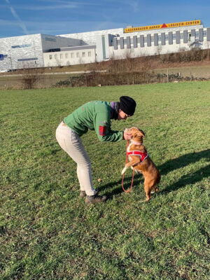 Gloria geht nun bereits in einer kleinen Hundegruppe in den Auslauf, was sehr gut klappt.