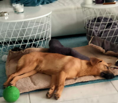 Guara ist in der Wohnung eine sehr ruhige, verschmuste, super brave und angenehme junge Hündin.