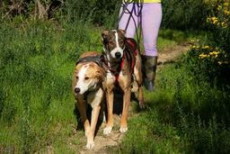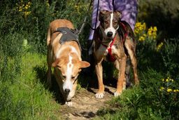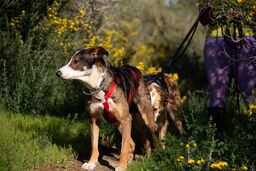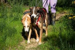 Sunna akzeptiert, dass man ihr im Kennel ein Geschirr anzieht. Sie lässt sich in der näheren Umgebung der Pflegestelle an der Leine spazieren führen und traut sich in der Zwischenzeit auch an belebteren Strassen zu spazieren. Helios hingegen verlässt seinen Kennel nicht so gerne. In ruhigeren Gegenden kann aber auch er auf Spaziergänge mitgenommen werden.