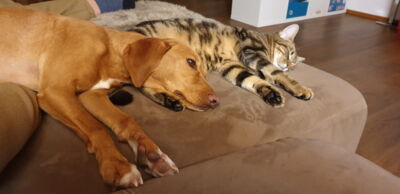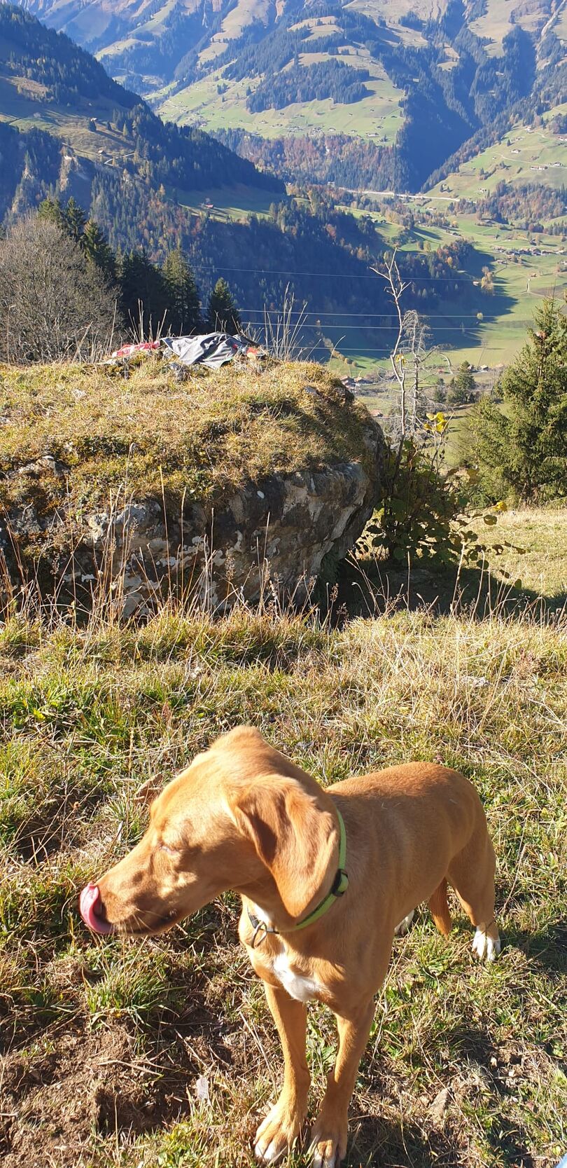 Oasis liebt Bergwanderungen und Waldspaziergänge mit all den interessanten Düften. Er läuft bei uns ohne Leine, sein Rückruf funktioniert sehr gut. Oasis liebt es mit Katzen zu spielen, überhaupt will er in allen Situationen gefallen und ist einfach eine Frohnatur. Das Alleinsein muss mit ihm noch geübt werden.