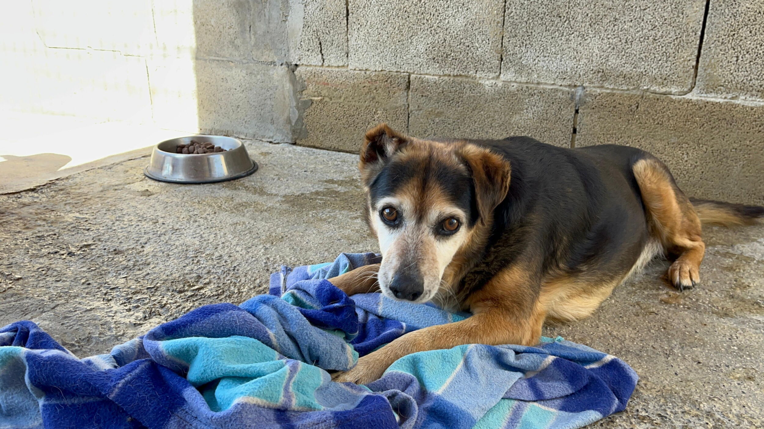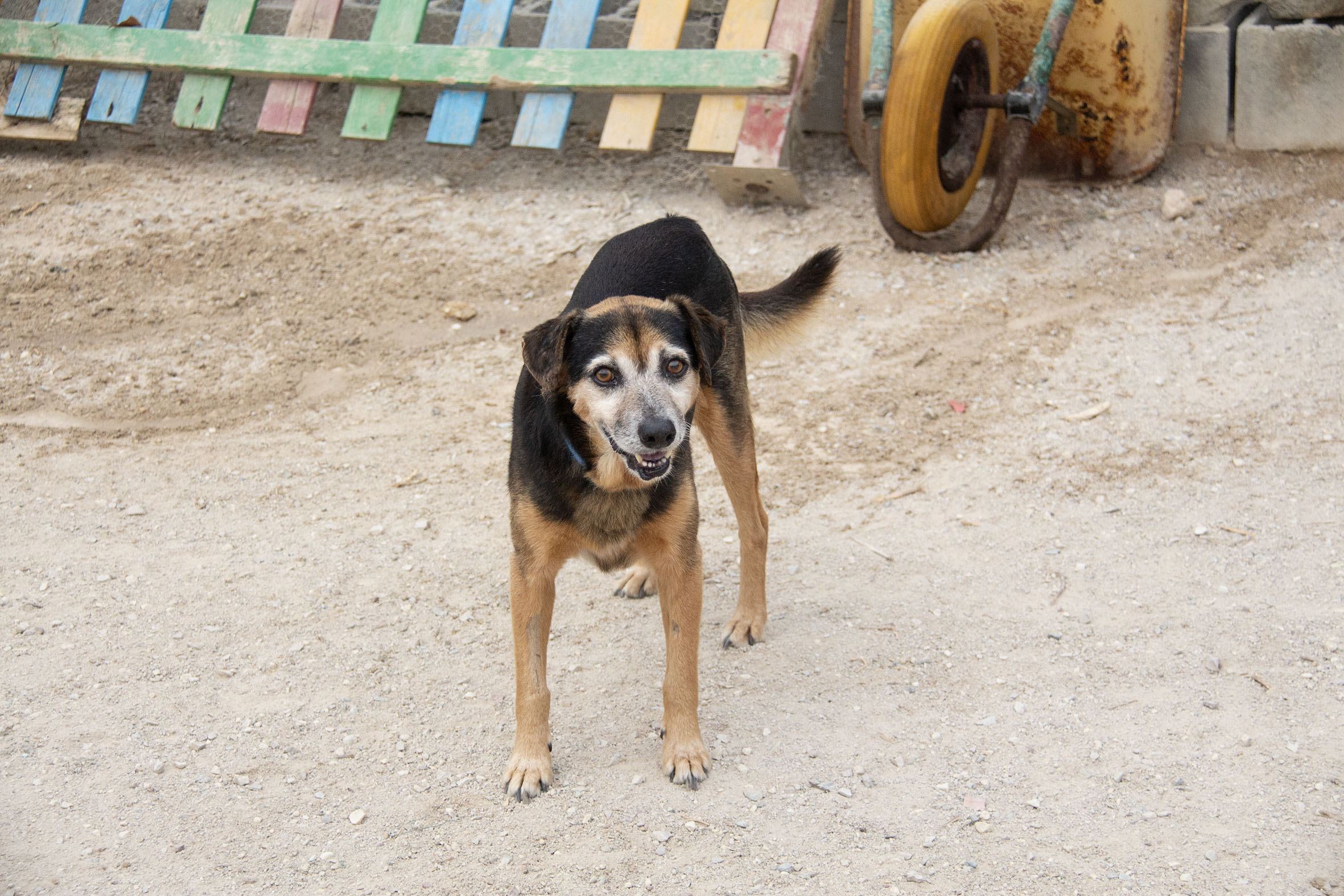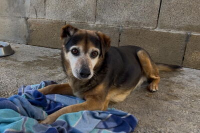 Poppet lebte zusammen mit anderen Hunden vor einem Supermarkt. Die Nachbarn haben die Hunde gefüttert. Die anderen Hunde wurden bereits gerettet, bis auch Poppet gerettet werden konnten und ins Melampo gebracht wurde.