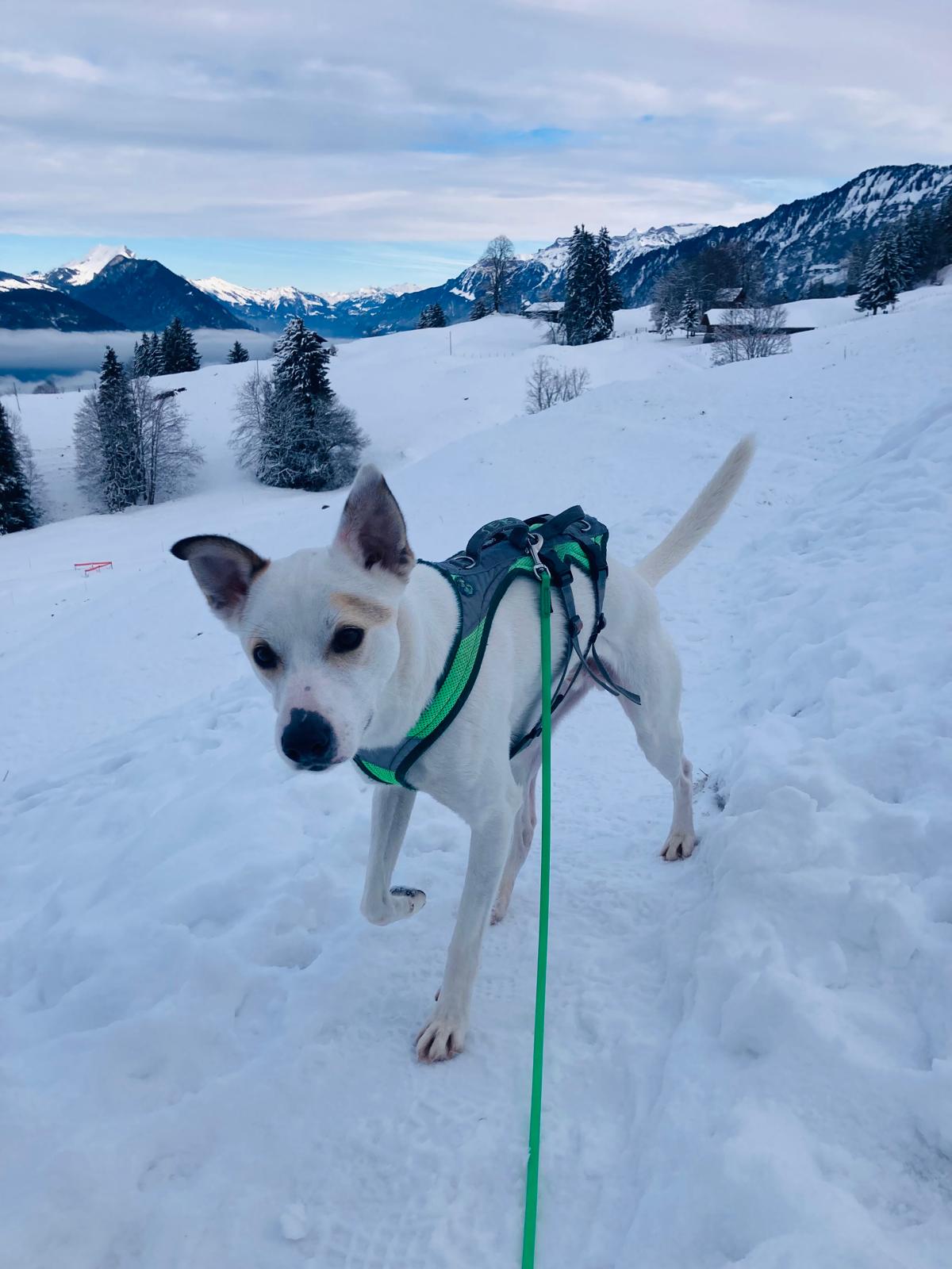 Er blühte langsam wieder auf, seine altbekannte Macke Plüschtiere zu schreddern und auszuhöhlen kam wieder, die Rute nicht mehr zwischen die Hinterläufe gezogen, an jeder Ecke schnüffeln beim Spaziergang etc.. Und dann kam der Schnee.... Er liebt es im Schnee zu toben, Schneebälle jagen, wälzen, gefrorene Pfützen zu knacken, im Schnee sah man sein freudiges, verspieltes Wesen.