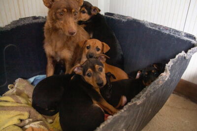 Allende (genannt nach Schriftstellerin Isabel Allende) lebte in einer Lagerhalle eines Industriegeländes mit ihren 5 Welpen, von wo sie am 2.2.21